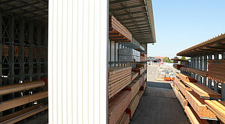 Afin de permettre à ses clients un meilleur aperçu et un accès plus rapide aux marchandises, BAUKING décida de stocker toutes les marchandises en bois dans un endroit centralisé du nouveau hall d’entreposage. En raison de ses rayonnages fonctionnant comme structure porteuse pour le toit et les parois, un tel système est nettement plus flexible et meilleur marché qu’un hall de stockage classique. BAUKING planifia la construction d’un hall composé de trois lignes de rayonnages dotées chacune d’une longueur d’environ 20 mètres. Les rayonnages cantilever de 7,8 mètres de haut sont équipés de sept niveaux de stockage.